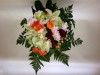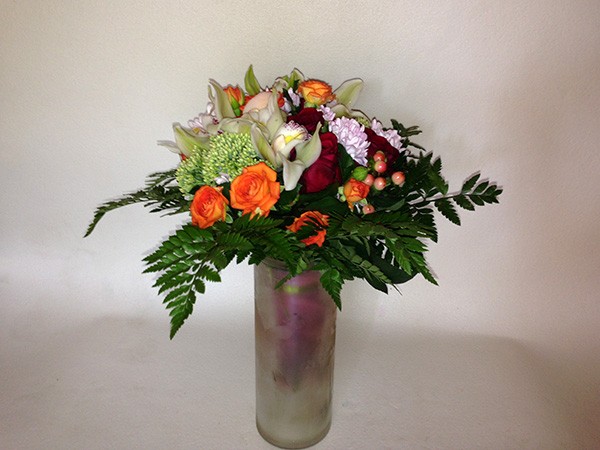 Vegyes kerek csokor, ami tartalmaz orchideát is.