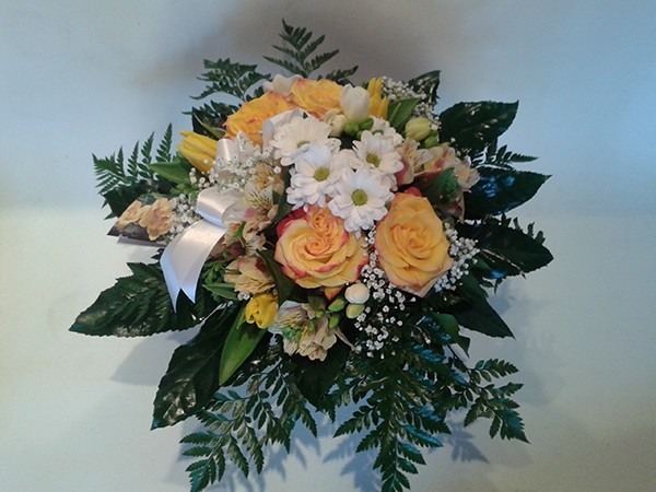 Vegyes csokor sárga és fehér virágokból.